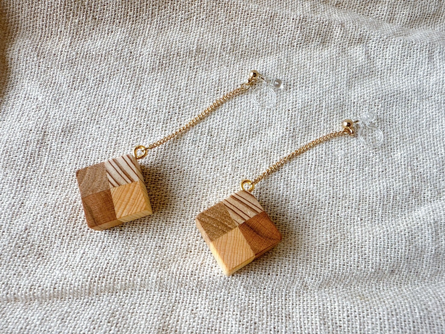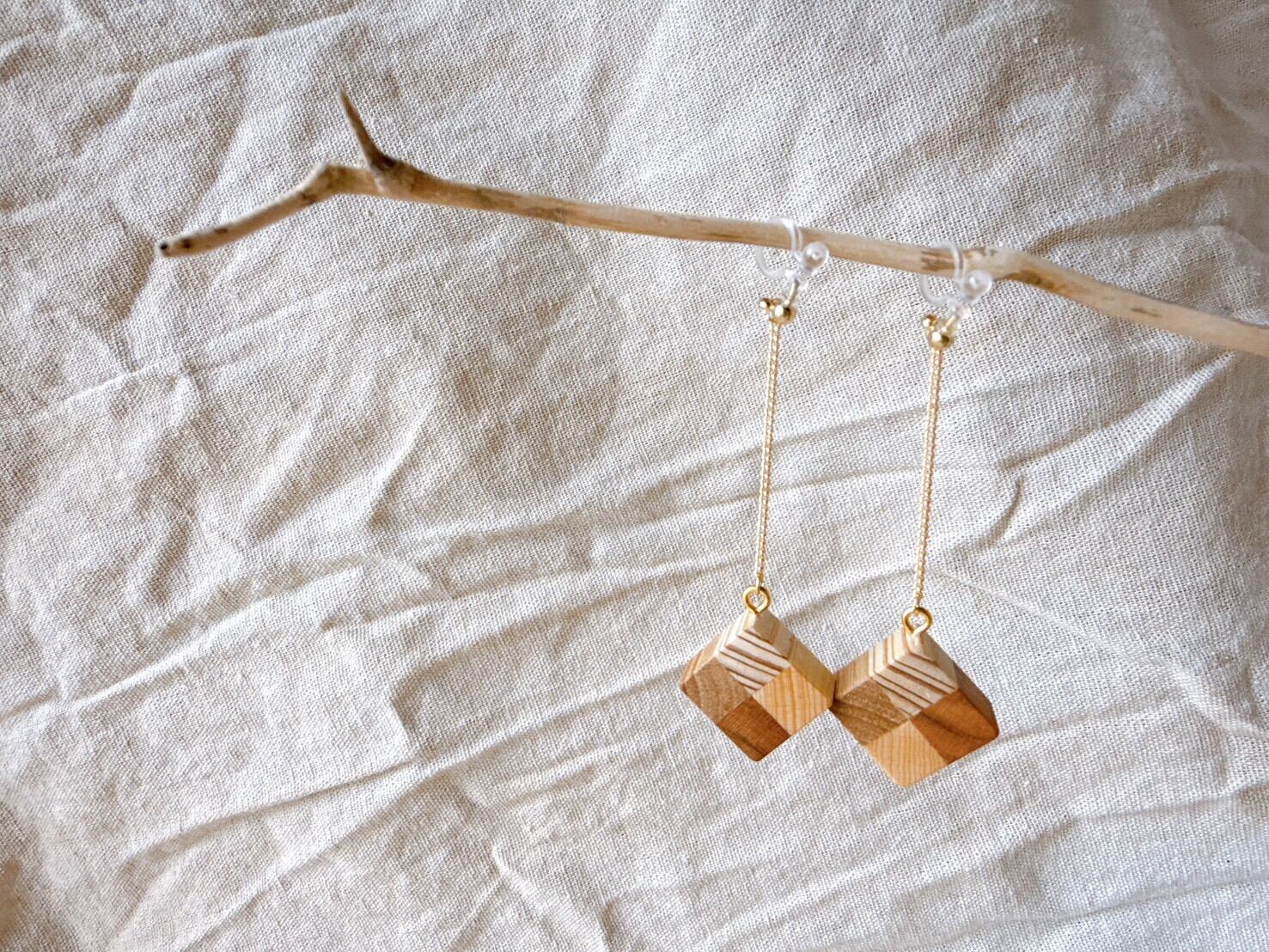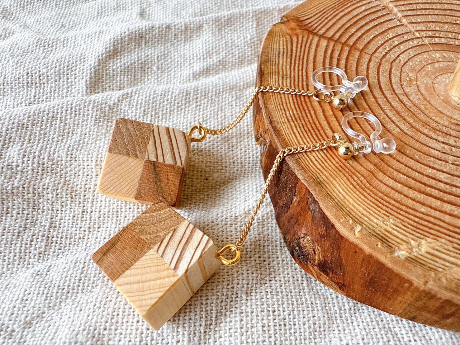 木の温もりが感じられるかわいいイヤリング です。サイズは15×15mmで、全長は60mm。スギ、クリ、ヒバ、ケヤキの木を張り合わせたデザインで、耳元をさりげなく引き立てる魅力的な大きさです。軽やかな着け心地で、デイリーにはもちろん、特別な日にもぴったりのアイテムです。