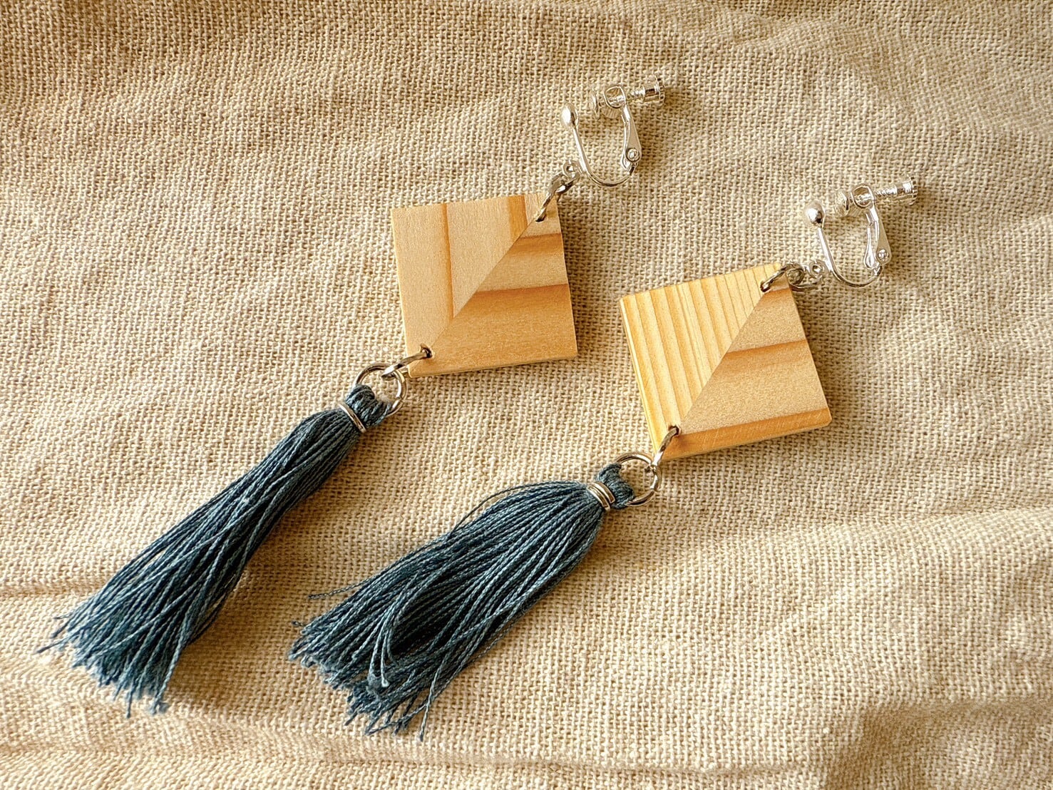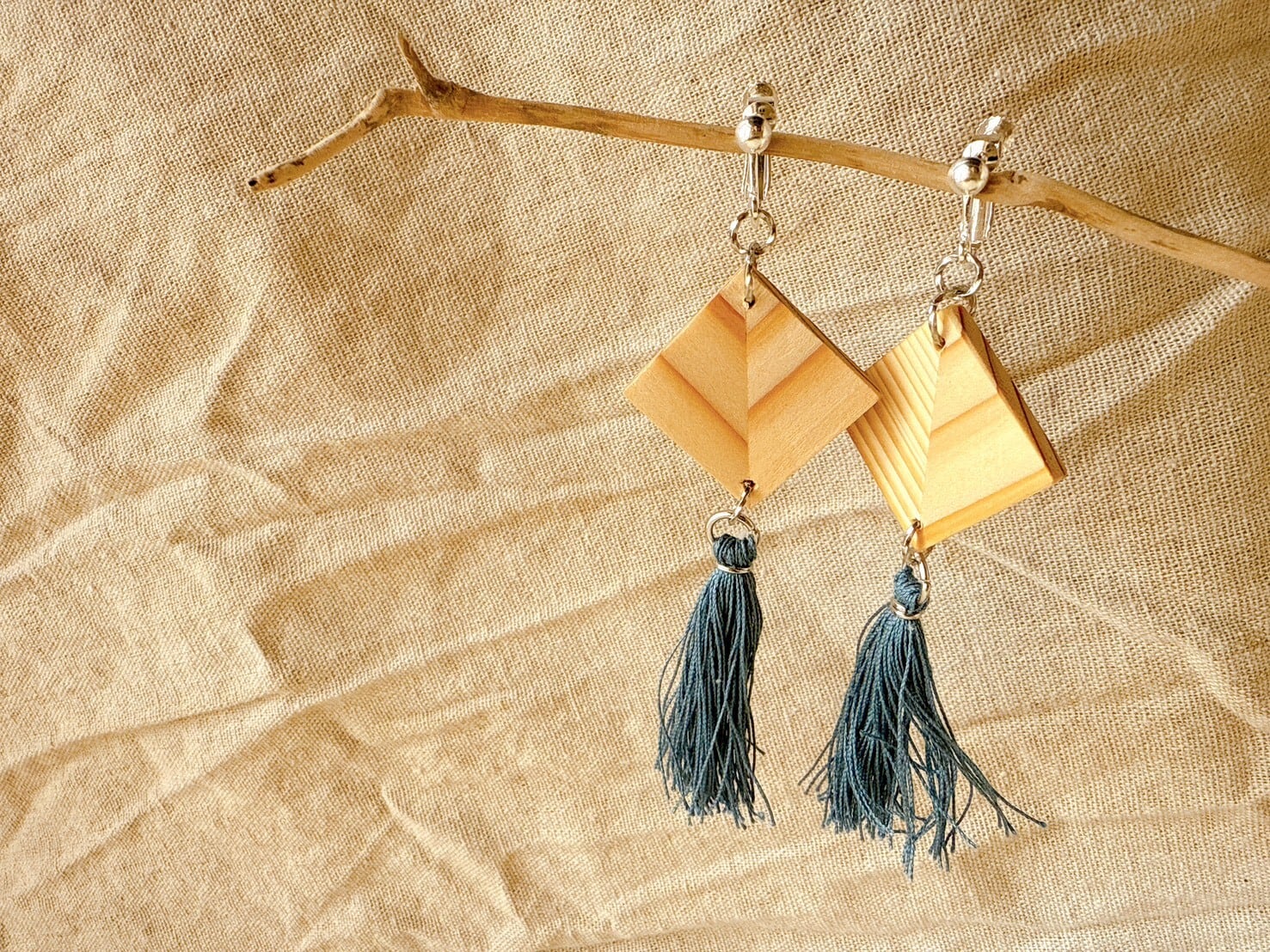 青いタッセルが特徴的で、自然素材の魅力をしっかりと楽しむことができる逸品。どんなコーディネートにも自然に溶け込み、杉の木の質感が耳元で優雅に揺れ、あなたのスタイルに個性的なアクセントを加えます。