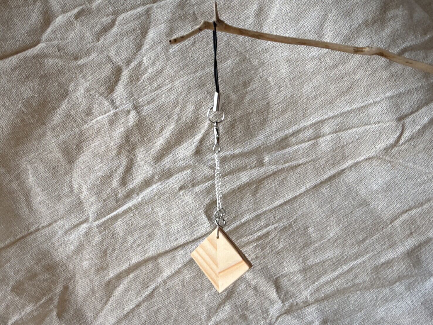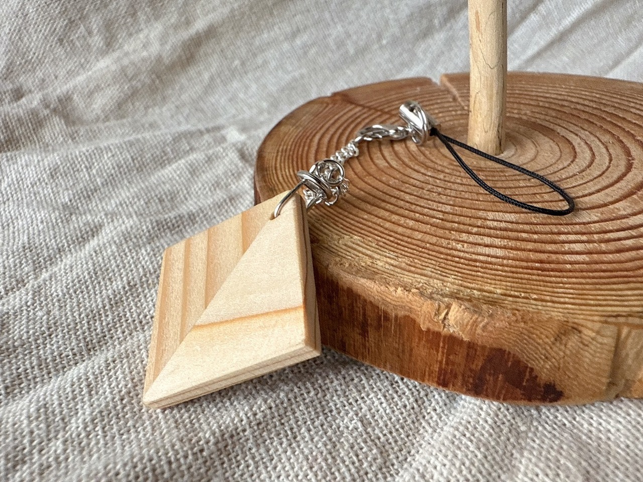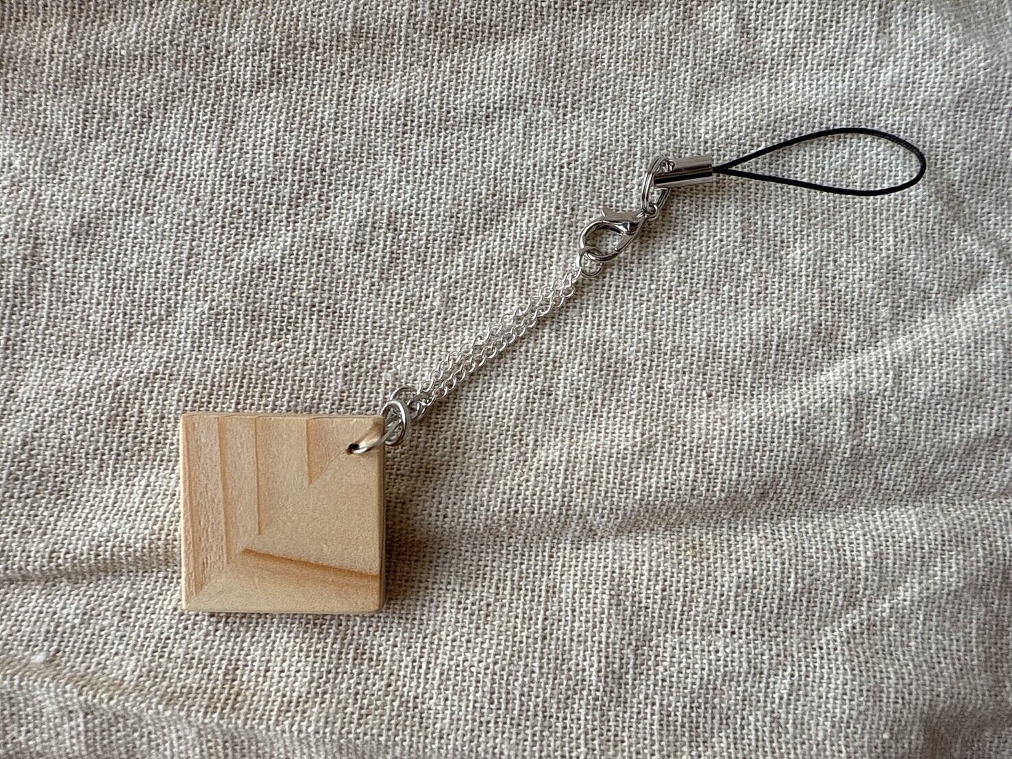 木の温もりが感じられる、シンプルで存在感あるストラップです。全長90㎜のこのストラップは、異なる木目を巧みに組み合わせたデザインが特徴で、上品なシルバーのチェーンが魅力を引き立てます。カバンや鍵などに添えることで、自然な雰囲気を演出しながら、さりげないアクセントを与えてくれるアイテムです。