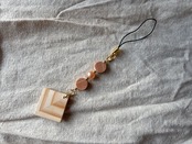 木の温もりが感じられる、かわいらしい印象のストラップです。全長100㎜のこのストラップは、四角と丸のパーツが組み合わさったデザインが特徴で、色味を合わせたピンクのパーツがより魅力を引き立てます。カバンや鍵などに添えることで、優しいアクセントを与えてくれるアイテムです。