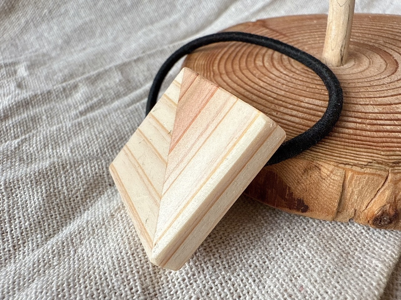 木の温もりが感じられる、大きめデザインのゴムです。サイズは30×30㎜で、あえて違う木目を合わせたスタイルが特徴です。このゴムは存在感がありながらも、シンプルな印象を与え、日常使いに最適なアイテムとなります。